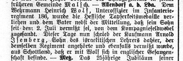 Tapferkeitsmedaille ("Israelitisches Familienblatt" vom 18.7.1918).