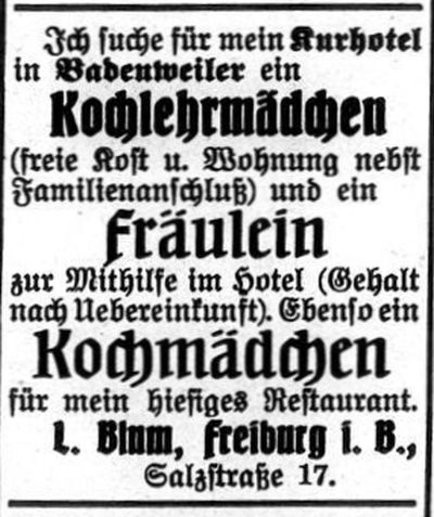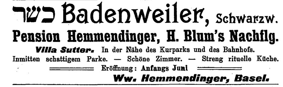 geführt von der Witwe Hemmendinger aus Basel (Anzeige 1910 s.u.).