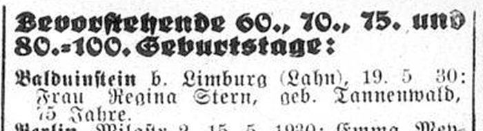 Balduinstein bei Limburg (Lahn), 19. Mai 1930: Frau Regina Stern geb.