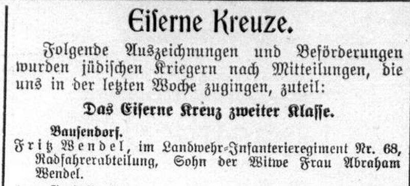 Bausendorf. Fritz Wendel, im Landwehr-Infanterie Regiment Nr. 68,