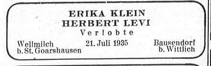 Verlobungsanzeige für Erika Klein und Herbert Levi (1935)
