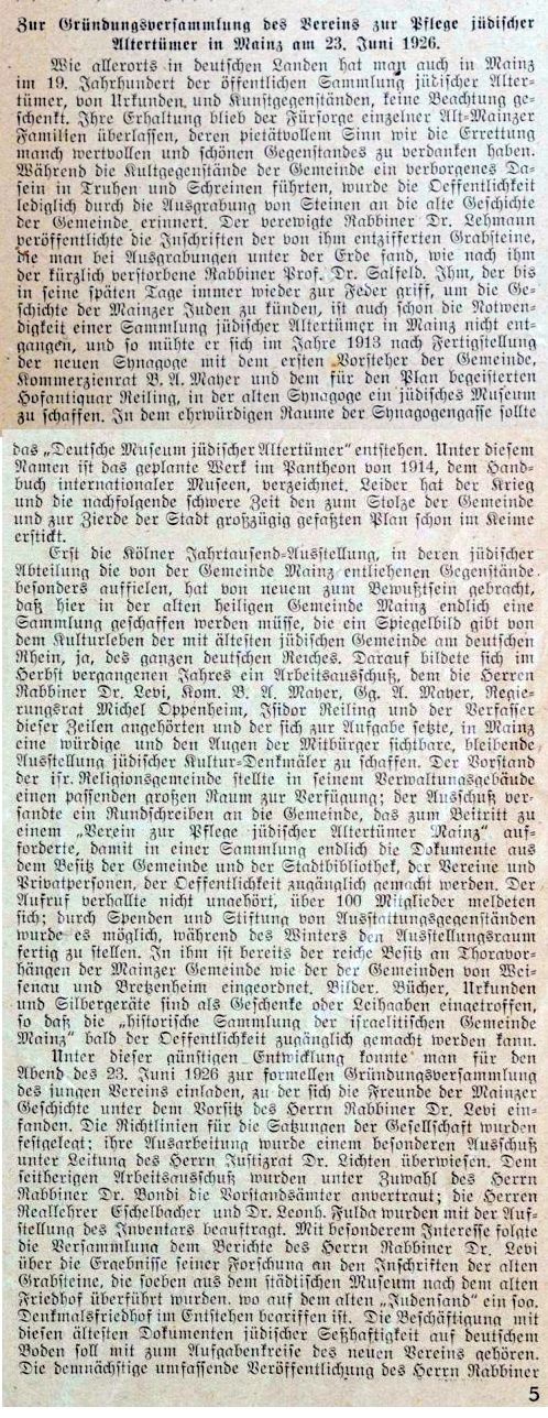 1921 in der Mainzer Hauptsynagoge eingeweiht wurde. Dabei wurde auf den schweren