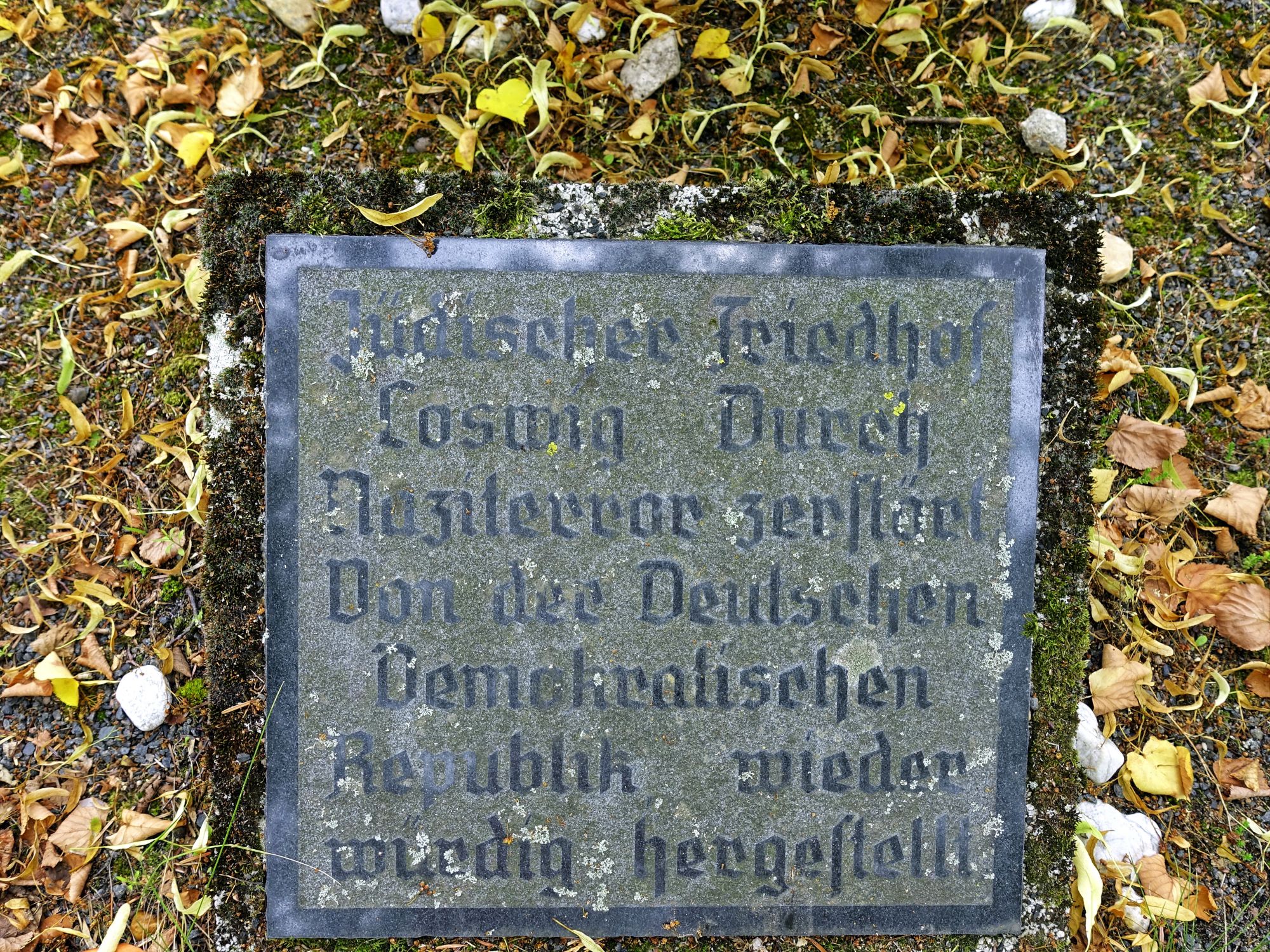 Grabsteine mit der Hinweistafel (links unten): "Jüdischer Friedhof Coswig.