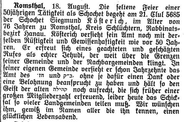 (Eckardroth) und Josef Korn (Romsthal). Das Amt des Schochet übernahm in der