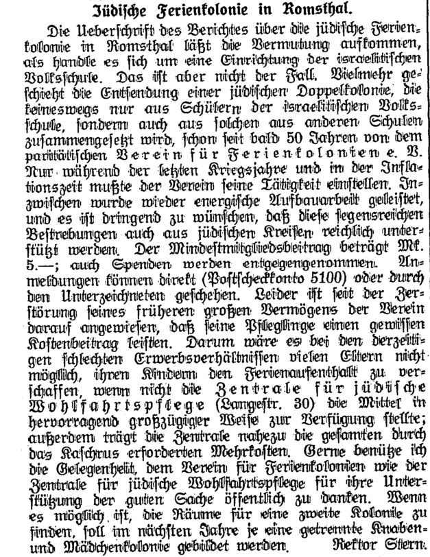 Bericht von der Ferienkolonie der jüdischen Kinder 1929 deutlich wird (siehe