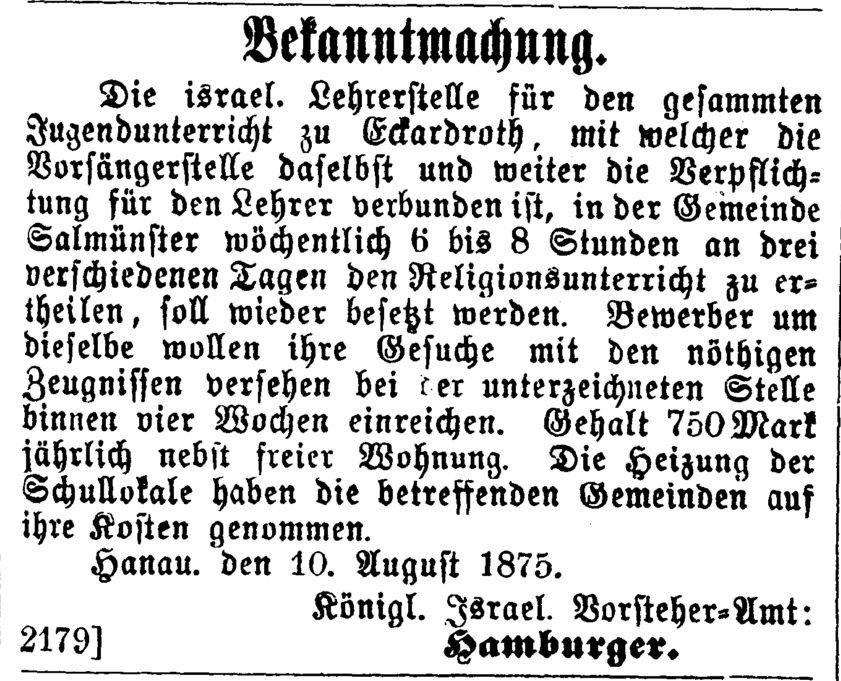 der Stelle der Lehrers, Vorbeters und Schochet mit den Gemeinden in Salmünster