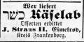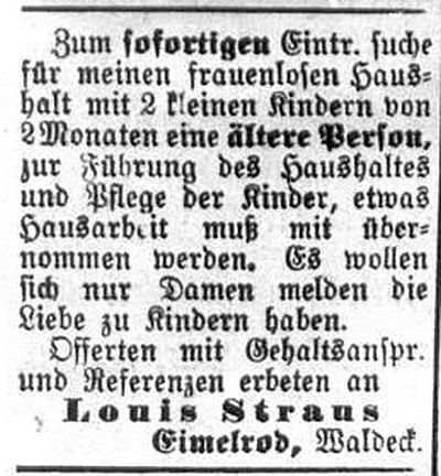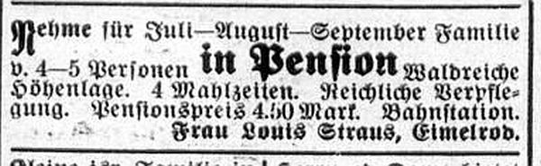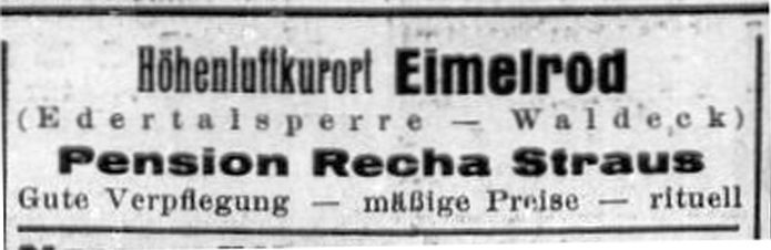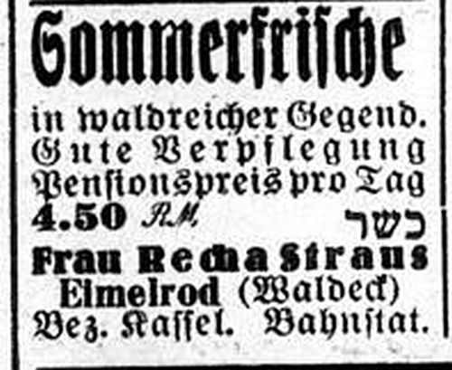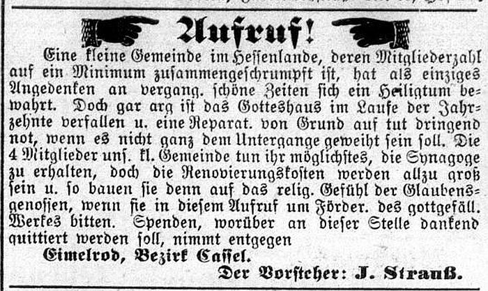 Im Auftrage der hiesigen vier Familien: J. Straus I, Eimelrod." |