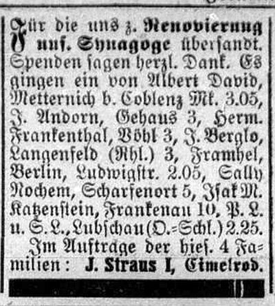Renovierung unserer Synagoge übersandten Spenden sagen herzlichen Dank.