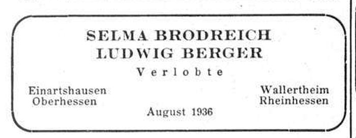 Anmerkung: Selma geb. Brodreich ist am 21. März 1914 in Einartshausen