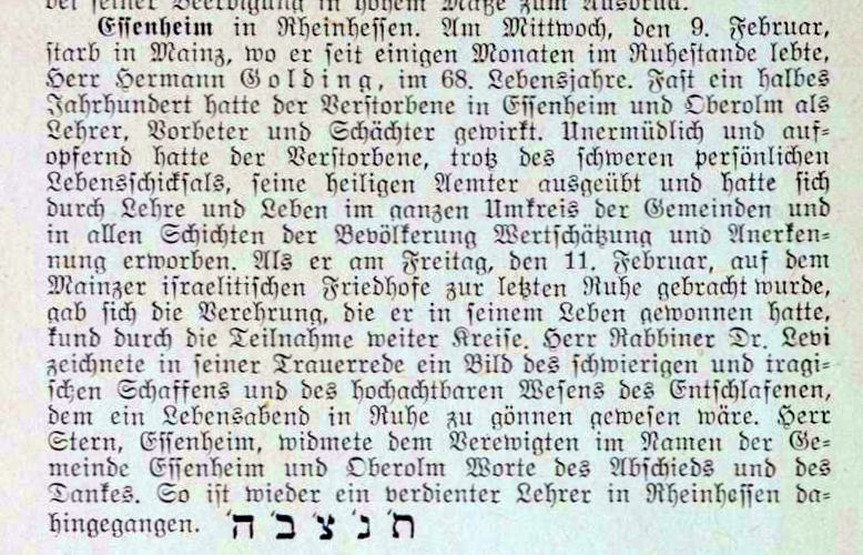 Hermann Golding als Lehrer, Kantor und Schochet in Essenheim und