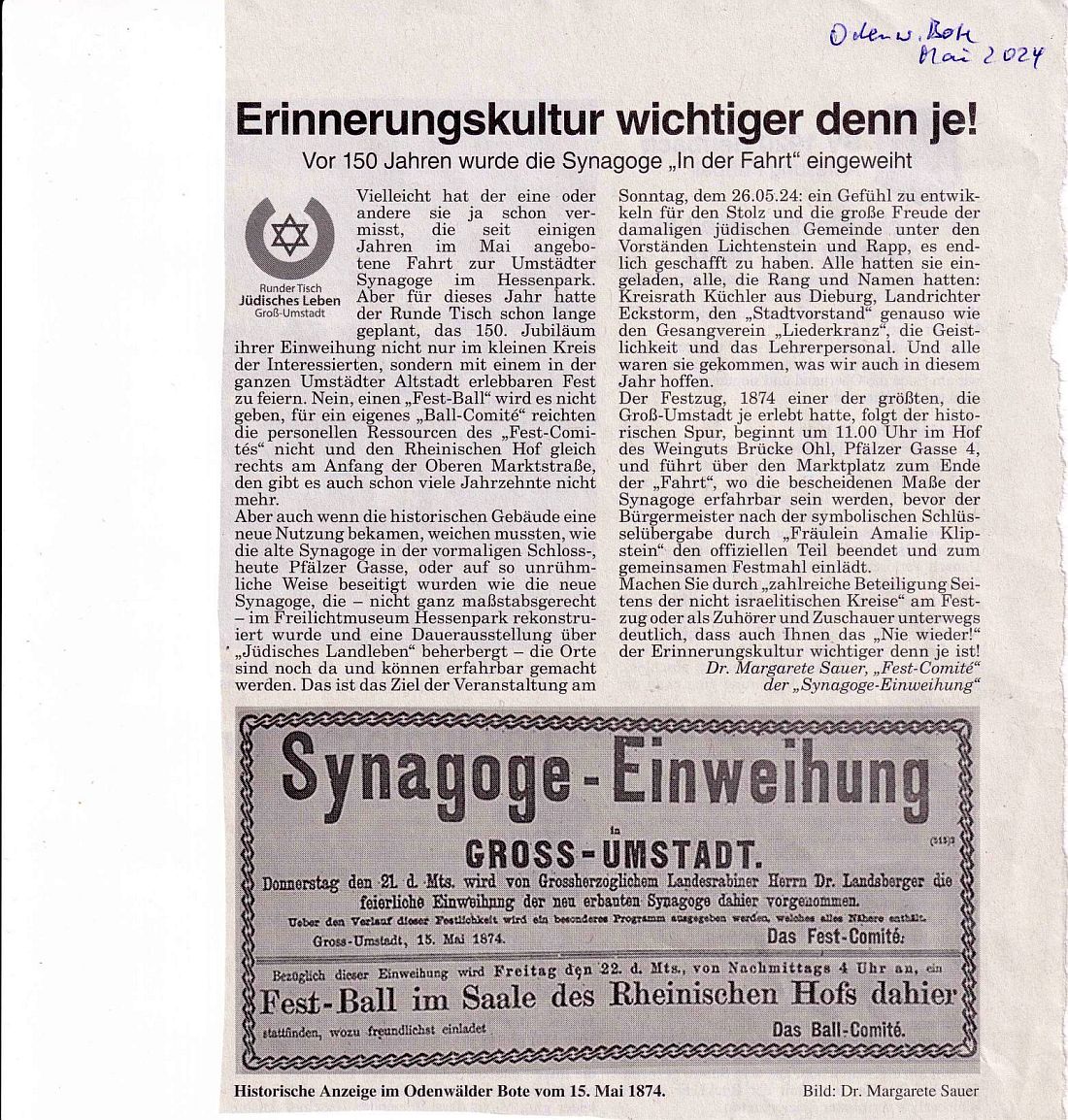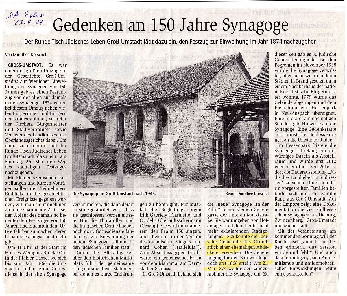 im "Darmstädter Echo" vom 23. Mai 2024: "Gedenken an 150 Jahre Synagoge.