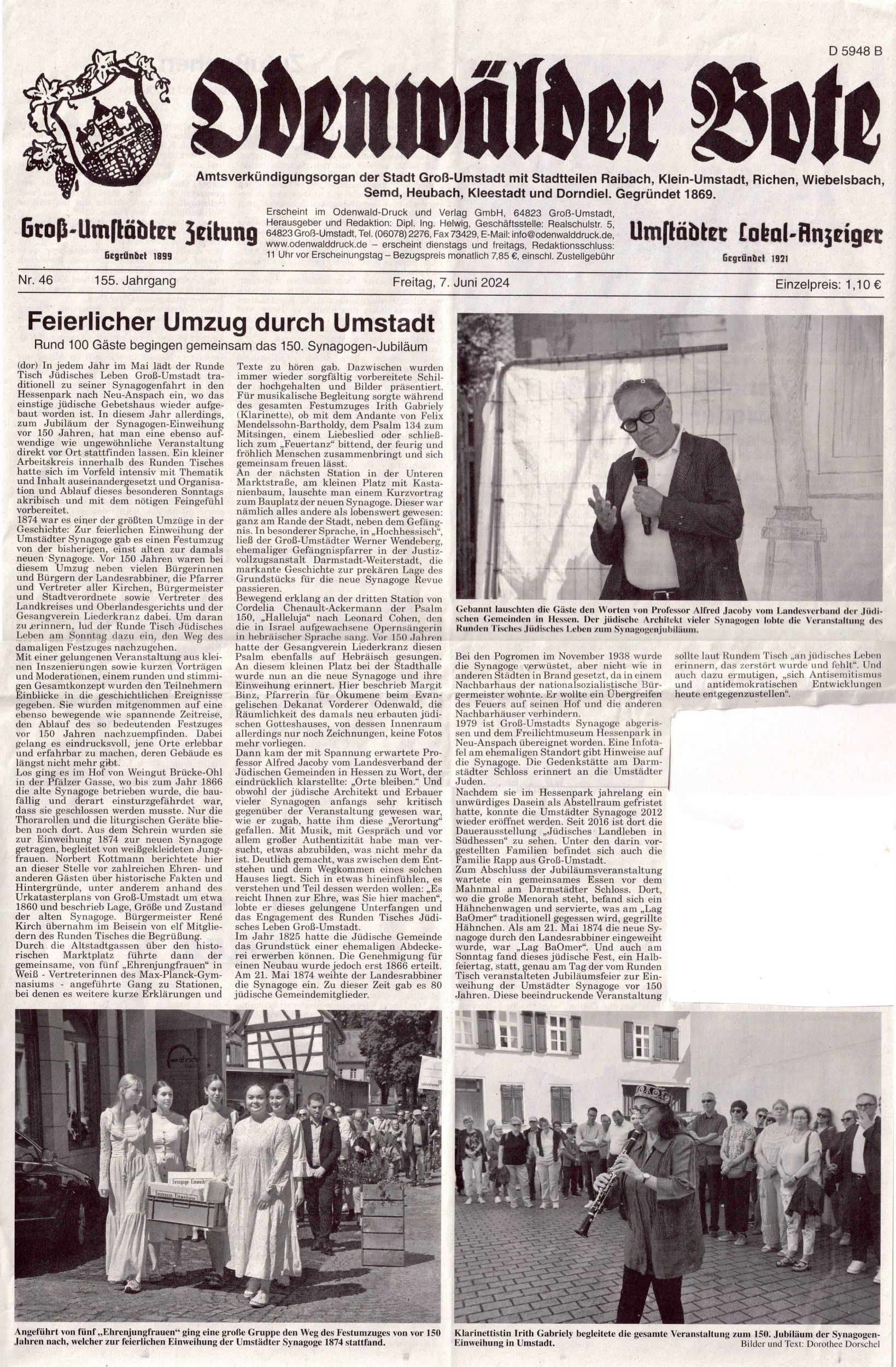 im "Odenwälder Boten" vom 7. Juni 2024: "Feierlicher Umzug durch Umstadt.