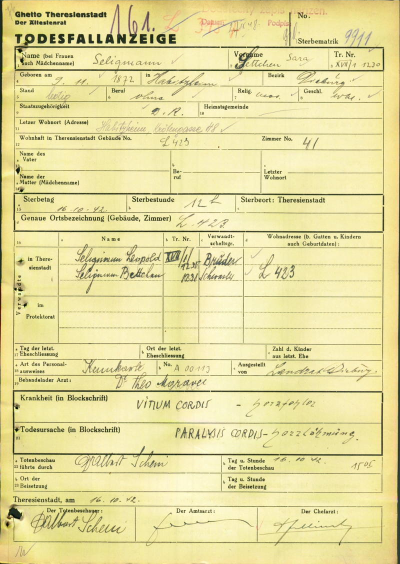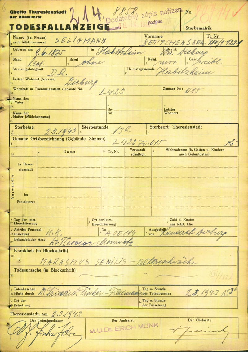 Todesfallanzeigen zu Personen, die im Ghetto Theresienstadt
