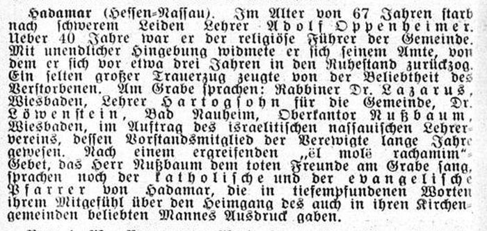 Um 1881 amtierte Lehrer Ostermann in Hadamar. Seit Dezember 1883 war Adolf Oppenheimer Lehrer in der Gemeinde: er