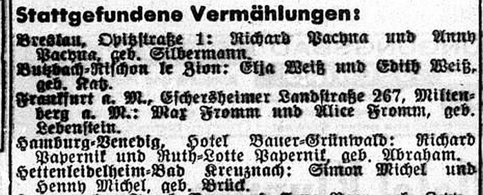 im "Israelitischen Familienblatt" vom 9. Mai 1934: "Stattgefundene