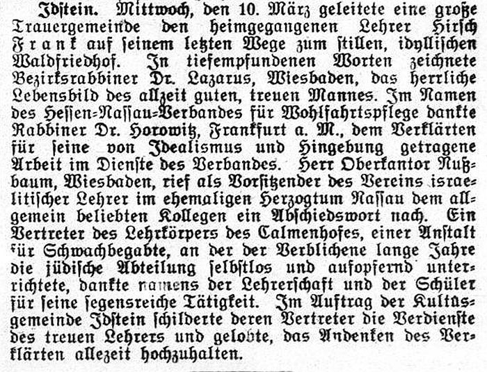 bis zu seinem Tod 1926 (s.u.) Lehrer Hirsch Frank (erstmals 1889 im