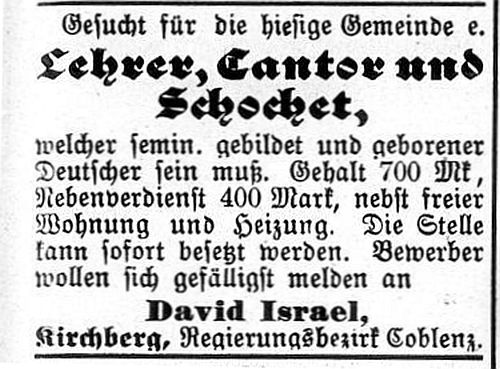 zugleich als Vorbeter und Schochet tätig war (siehe Ausschreibungen der Stelle