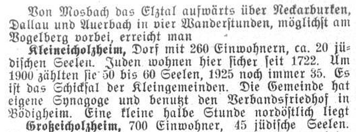 1933 lebten noch 28 jüdischen Personen in Kleineicholzheim. Trotz der