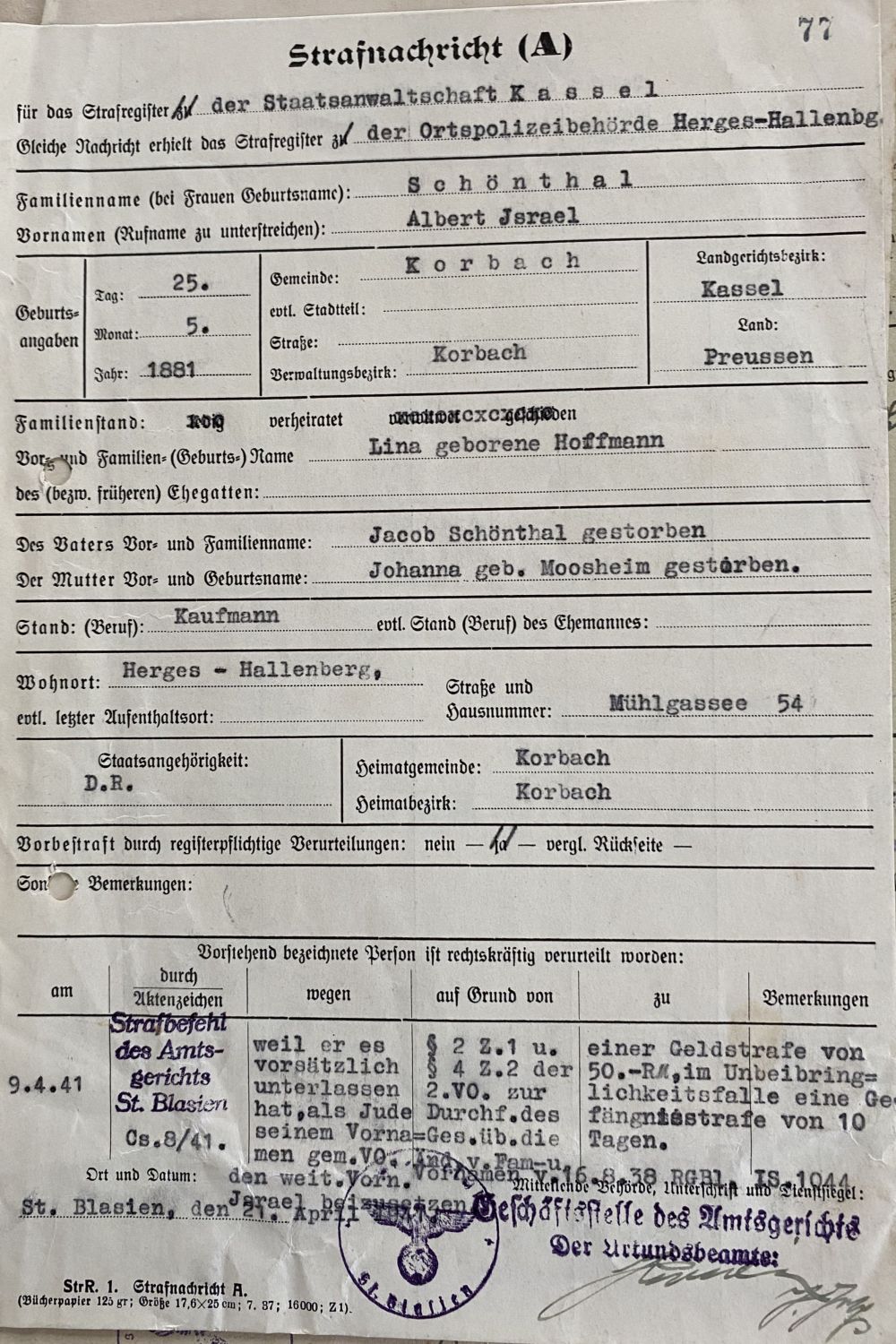 auf online einsehbare Familienregister der jüdischen Gemeinde Korbach mit