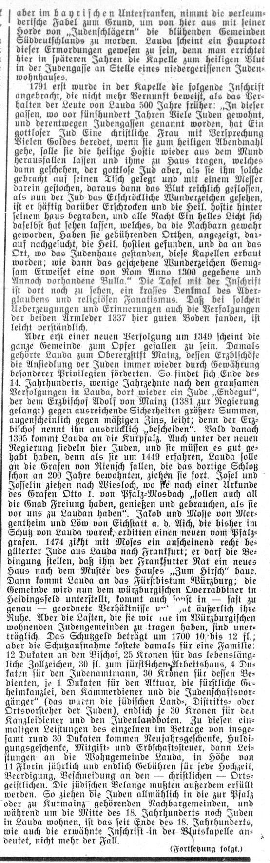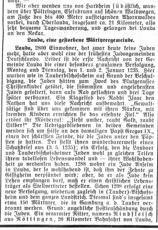 aber im bayrischen Unterfranken, nimmt die verleumderische Fabel zum Grund, um von hier aus mit seiner Horde von 'Judenschlägern' die blühenden Gemeinden Süddeutschlands zu morden. Lauda scheint ein Hauptort dieser Ermordungen gewesen zu sein, denn man errichtet hier in späteren Jahren die Kapelle zum heiligen Blut in der Judengasse an Stelle eines niedergerissenen Judenwohnhauses.