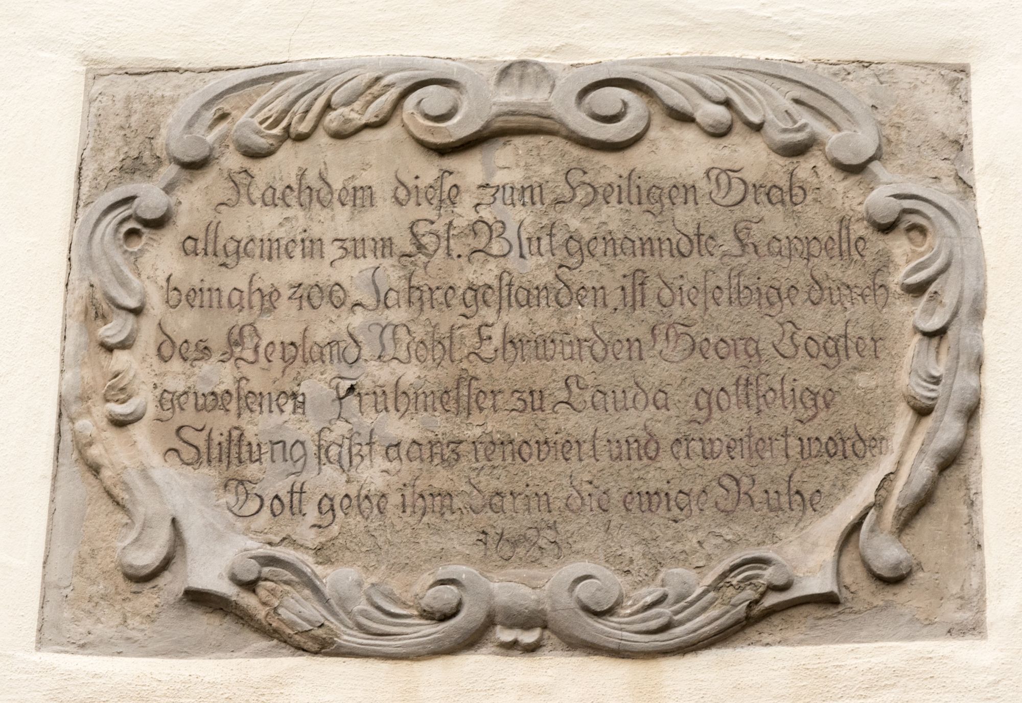 1791 erst wurde in der Kapelle die folgende Inschrift angebracht, die nicht mehr Vernunft beweist, als das Ver­halten der Leute von Lauda 500 Jahre früher: 'In dieser gassen, wo vor fünfhundert Jahren Viele Juden gewohnt, und derentwegen Judengassen genannt worden, hat Ein gottloser Jud Eine christliche Frau mit Versprechung Vielen Goldes beredet, wenn sie zum heiligen Abendmahl gehe, solle sie die heilige Hostie wieder aus dem Mund herausfallen lassen und ihme zu Haus tragen, welches dann geschehen, der gottlose Jud aber, als sie ihm solche gebracht auf seinen Tisch gelegt und mit einem Messer darein gestochen, daraus dann das Blut reichlich geflossen, als nun der Jud das Erschröckliche Wunderzeichen gesehen, ist er häftig darüber Erschrocken und die Heilige Hostie hinter seinem Haus begraben, und alle Nacht Ein Helles Licht sich daselbst hat sehen lassen, welches, da die Nachbarn gewahr geworden, Haben sie gebührenden Orthen, angezeigt, darauf nachgesucht, die Heilige Hostien gefunden, und da an das Ort, wo das Judenhaus gestanden, diese Kapellen erbaut worden; wie dann das geschehene Wunderzeichen Genugsam Erweiset eine von Rom Anno 1300 gegebene und Anno 1300 vorhandene Bulla." Die Tafel mit der Inschrift ist dort noch zu sehen, ein krasses Denkmal des Aberglaubens und religiösen Fanatismus. Dass bei solchen Überzeugungen und Erinnerungen auch die Verfolgungen der beiden Armleder 1337 hier guten Boden fanden, ist leicht verständlich.