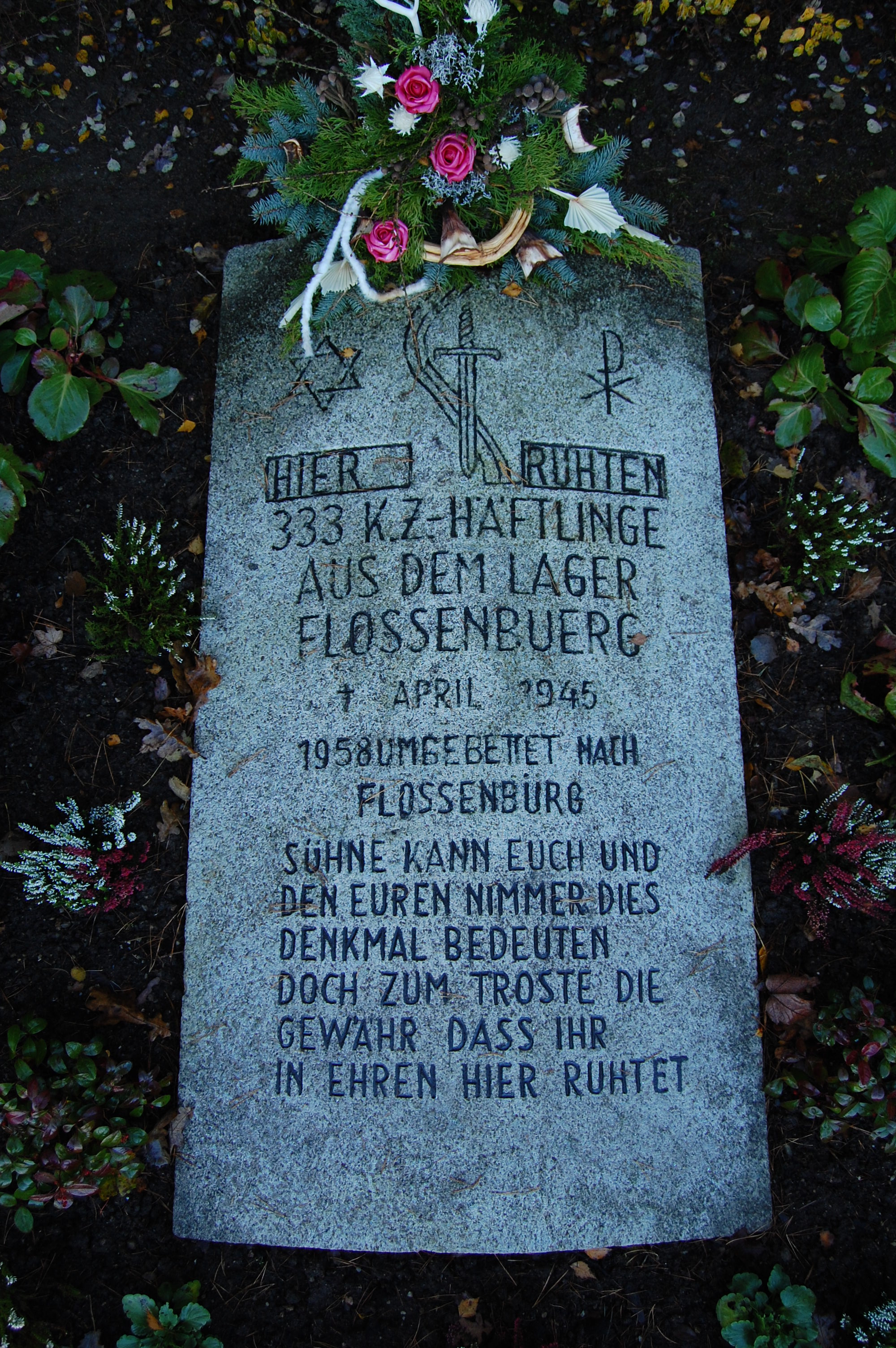 der Gedenktafel: "Hier ruhten 333 KZ-Häftlinge aus dem Lager Flossenbürg,