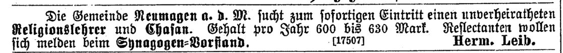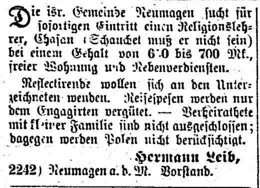 Vorbeter und Schächter tätig war (vgl. Ausschreibung der Stelle von 1872