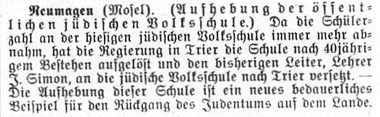 1881), 1887/88 J.Heß (erteilt Unterricht in Neumagen und Niederemmel). 1891 wurde die israelitische Religionsschule in eine Elementarschule