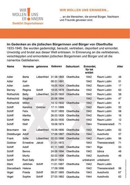deportierten und ermordeten jüdischen Bürgerinnen und Bürgern von Oberthulba