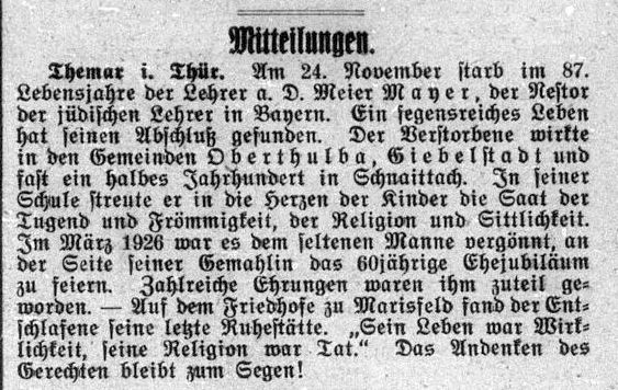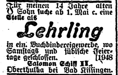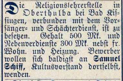 Oberthulba, um 1903 wird Lehrer L. Uhlfelder in Oberthulba genannt (J.