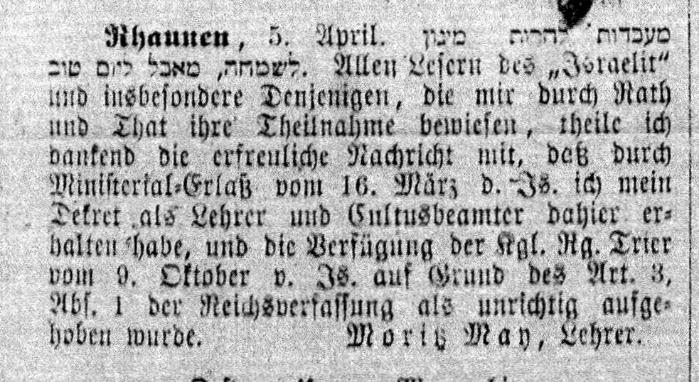 May aus Geldersheim (bei Schweinfurt; May war zuvor Lehrer in Laufersweiler