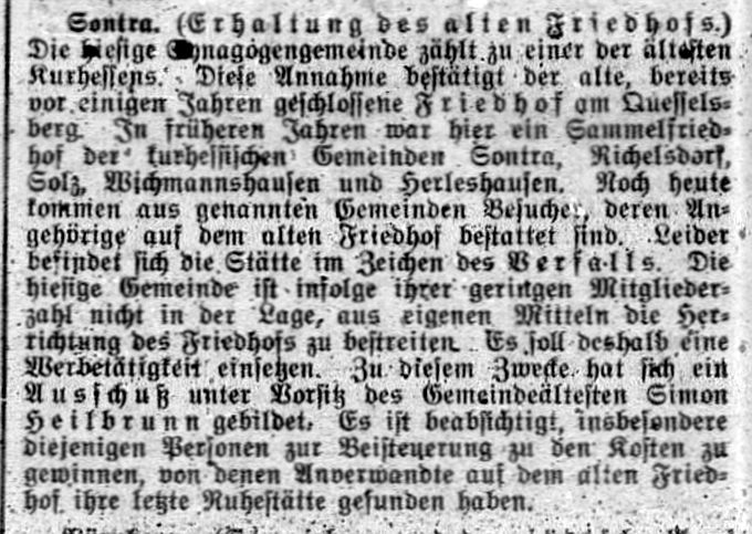 alter Friedhof. Sontra, 20. Juli (1927). Die hiesige Synagogengemeinde