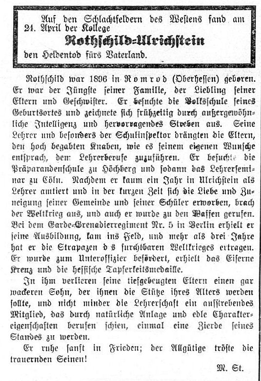 Rothschild (geb. 11.9.1895 in Romrod, gef. 24.4.1918), Moritz Schloss (geb.