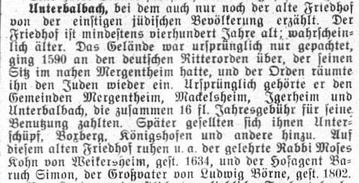 Ob nicht noch weitere in Mergentheim (möglicherweise auch in anderen Orten) gestorbene Juden in Unterbalbach beerdigt wurden, ohne notiert zu sein, steht noch dahin.