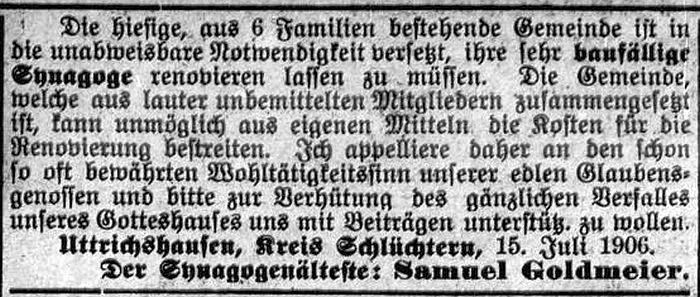 Uttrichshausen verlassen. In der NS-Zeit konnten mehrere der jüdischen Einwohner