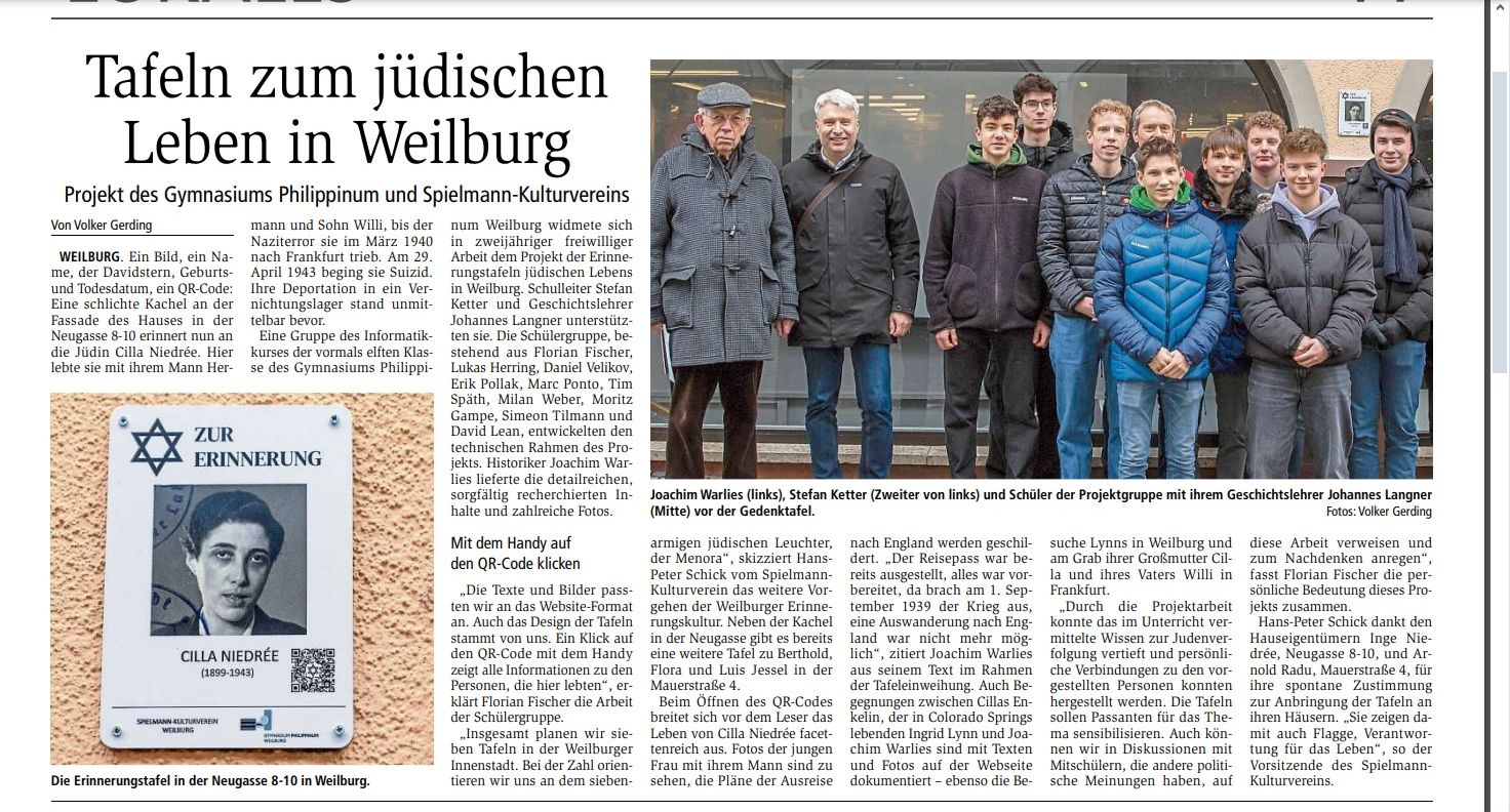 "Tafeln zum jüdischen Leben in Weilburg. Projekt des Gymnasiums
