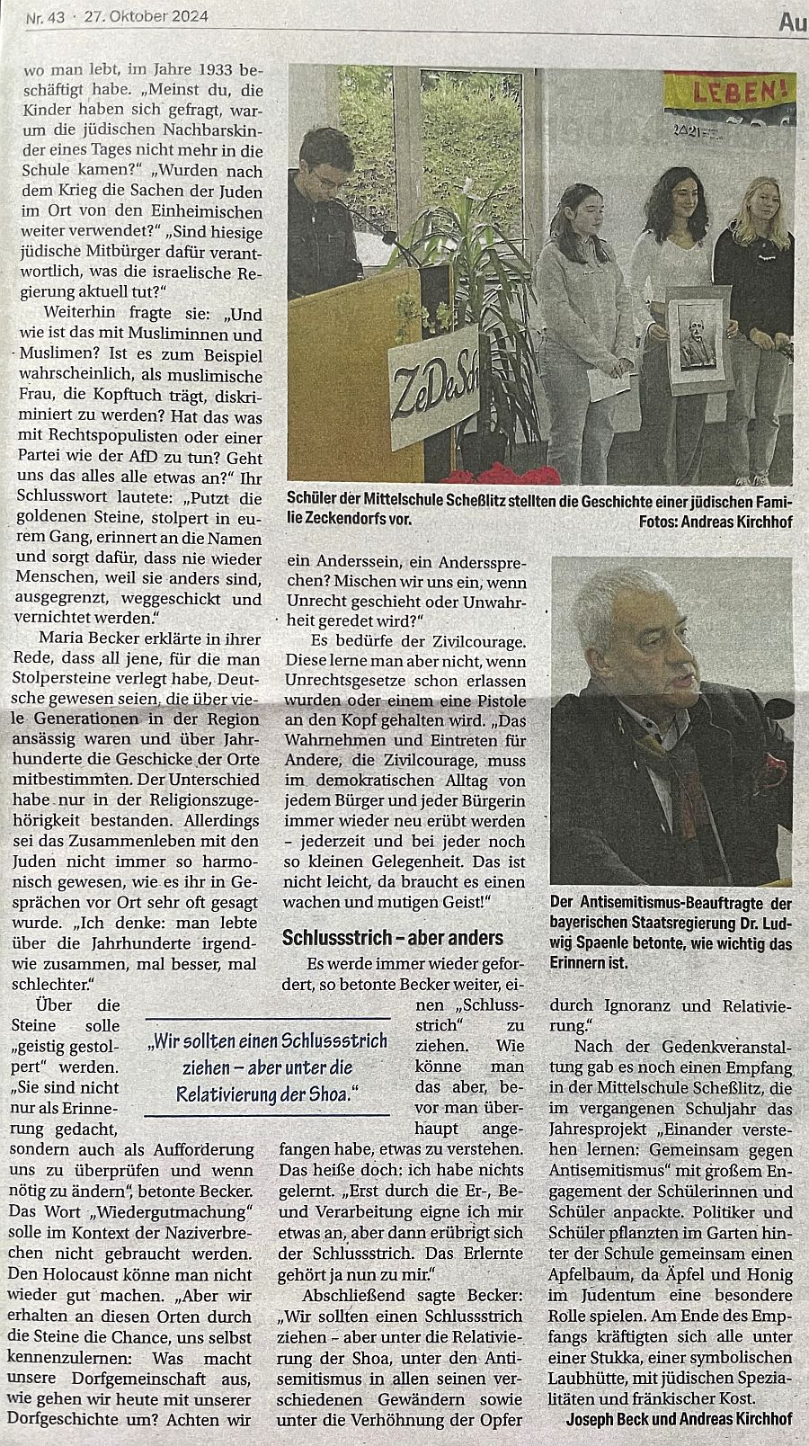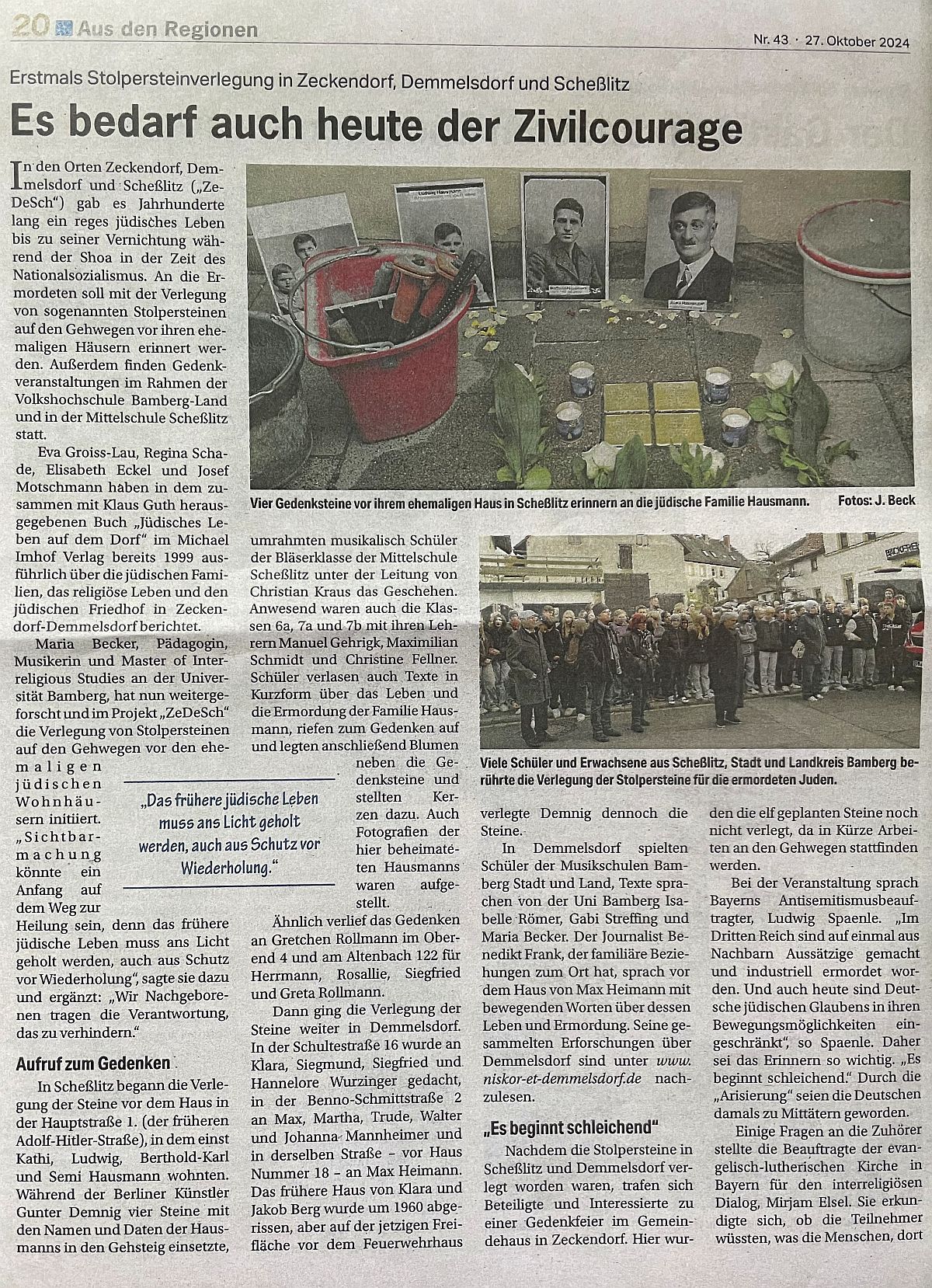 vom 27. Oktober 2024: "Erstmals Stolpersteinverlegung in Zeckendorf,
