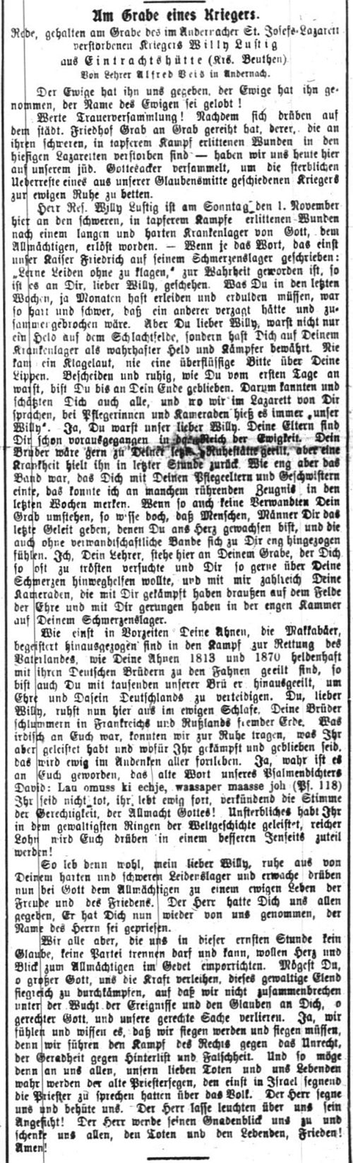 in Eintrachtshütte. Die Beisetzung von Wilhelm Lustig war am 3. November 1914 in
