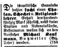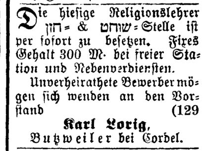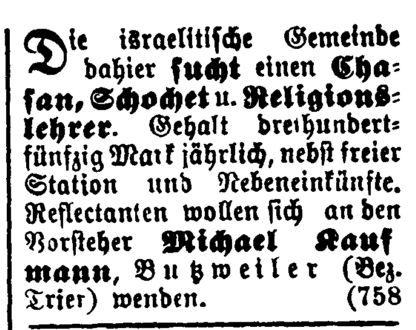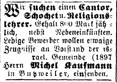 Religionslehrer angestellt, der zugleich als Vorbeter und Schochet tätig war (s.u. Ausschreibungen