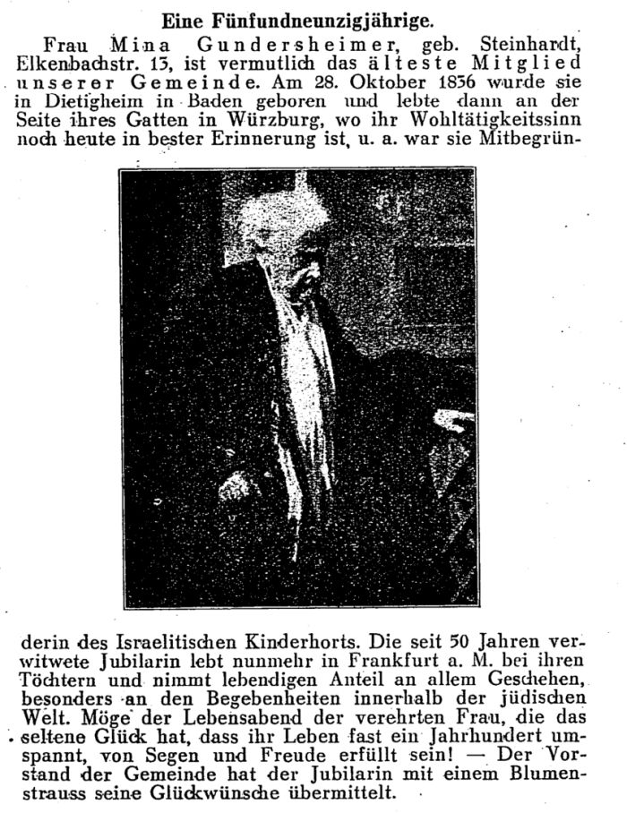 1931 S. 66: "Eine Fünfundneunzigjährige. Frau Mina Gundersheimer