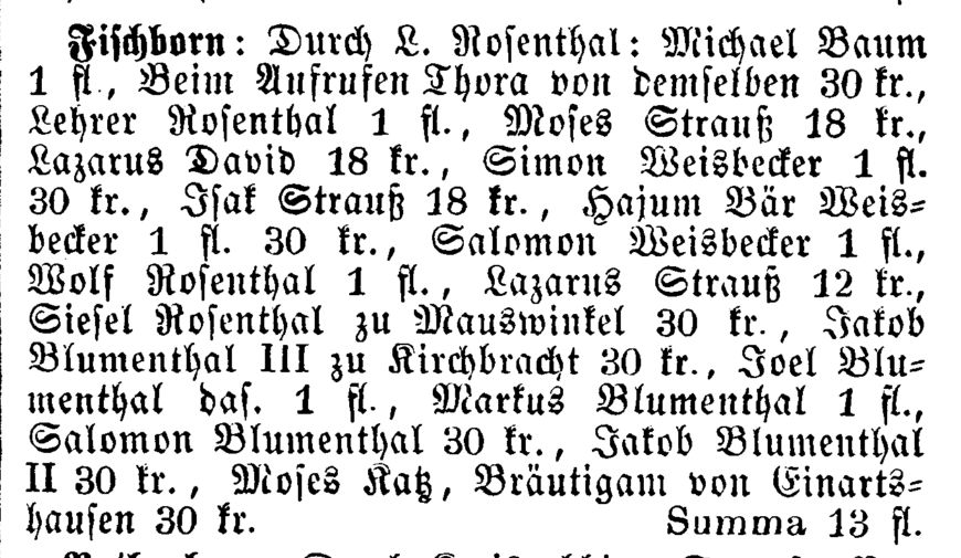 war. Um 1869/70 wird als Lehrer in Fischborn L. Rosenthal genannt. Als die Zahl