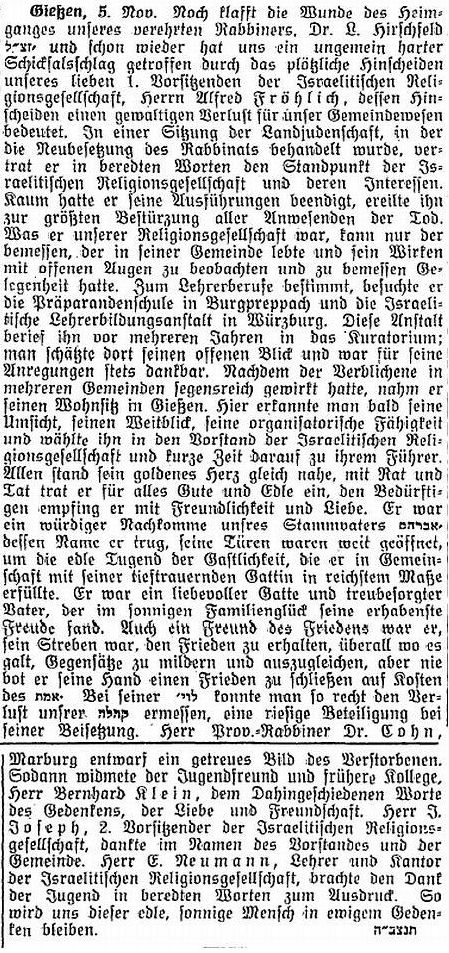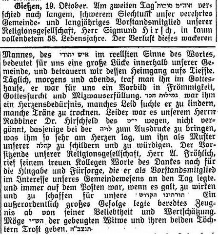 Bericht zum Tod von Provinzialrabbiner Dr. Hirschfeld (1933)
