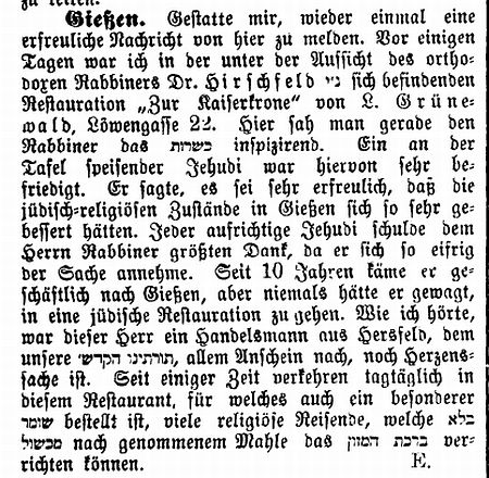 Unter Aufsicht seiner Ehrwürden Provinzialrabbiner Dr. Hirschfeld – Gießen.