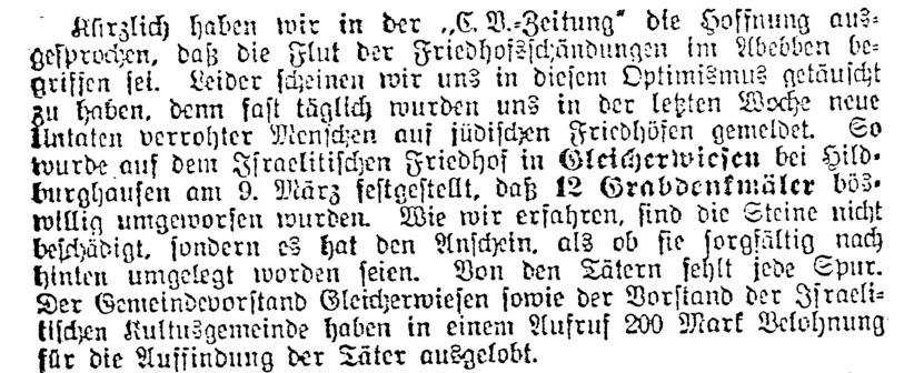vom 16. März 1928: "Neue Friedhofsschändungen. Auf dem