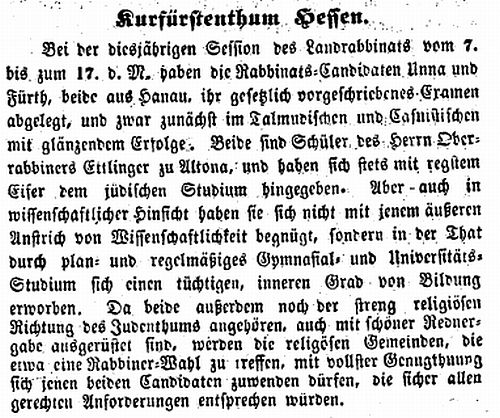 Rabbinats-Kandidaten Unna und Fürth aus Hanau haben ihr Examen abgelegt (1852)