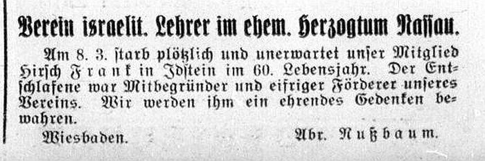 bis zu seinem Tod 1926 (s.u.) Lehrer Hirsch Frank (erstmals 1889 im