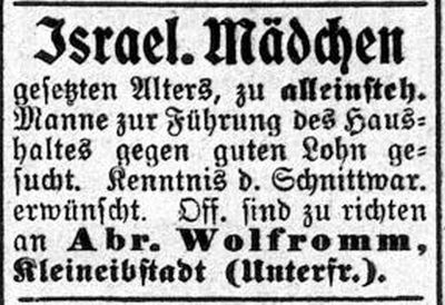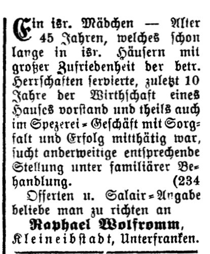 Anzeige in der Zeitschrift "Der Israelit" vom 10. Januar 1896: "Ein israelitisches Mädchen — Alter 45 Jahren, welches schon lange in israelitischen Häusern mit großer Zufriedenheit der betreffenden Herrschaften servierte, zuletzt 10 Jahre der Wirtschaft eines Hauses Vorstand und teils auch im Spezerei-Geschäft mit Sorgfalt und Erfolg mittätig war, sucht anderweitige entsprechende Stellung unter familiärer Behandlung.