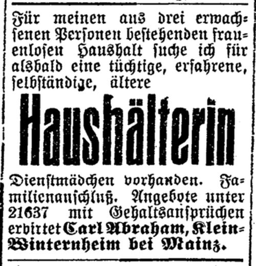 Dienstmädchen vorhanden. Familienanschluss. Angebote unter 21637 mit Gehaltsansprüchen erbittet Carl Abraham, Klein-Winternheim bei Mainz."