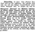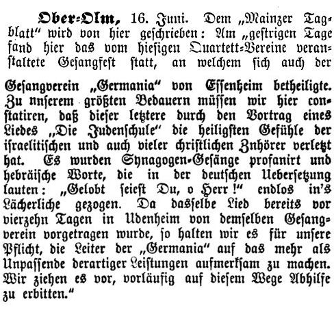 Artikel in der Zeitschrift "Der Israelit" vom 25. Juni 1879: "Ober-Olm, 16. Juni. Dem 'Mainzer Tagblatt' wird von hier geschrieben: Am gestrigen Tage fand hier das vom hiesigen Quartett-Vereine veranstaltete Gesangfest statt, an welchem sich auch der Gesangverein 'Germania' von Essenheim beteiligte. Zu unserem größten Bedauern müssen wir hier konstatieren, dass dieser letztere durch den Vortrag eines Liedes 'Die Judenschule' die heiligsten Gefühle der israelitischen und auch vieler christlichen Zuhörer verletzt hat. Es wurden Synagogen-Gesänge profaniert und hebräische Worte, die in der deutschen Übersetzung lauten: 'Gelobt seiest Du, o Herr!' endlos ins Lächerliche gezogen. Da dasselbe Lied bereits vor vierzehn Tagen in Udenheim von demselben Gesangverein vorgetragen wurde, so halten wir es für unsere Pflicht, die Leiter der 'Germania' auf das mehr als Unpassende derartiger Leistungen aufmerksam zu machen. Wir ziehen es vor, vorläufig auf diesem Wege Abhilfe zu erbitten."