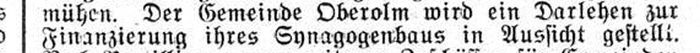 Mitteilung im "Israelitischen Familienblatt" vom 16. Oktober 1930: "Der Gemeinde Ober-Olm wird ein Darlehen zur Finanzierung ihres Synagogenbaus in Aussicht gestellt."